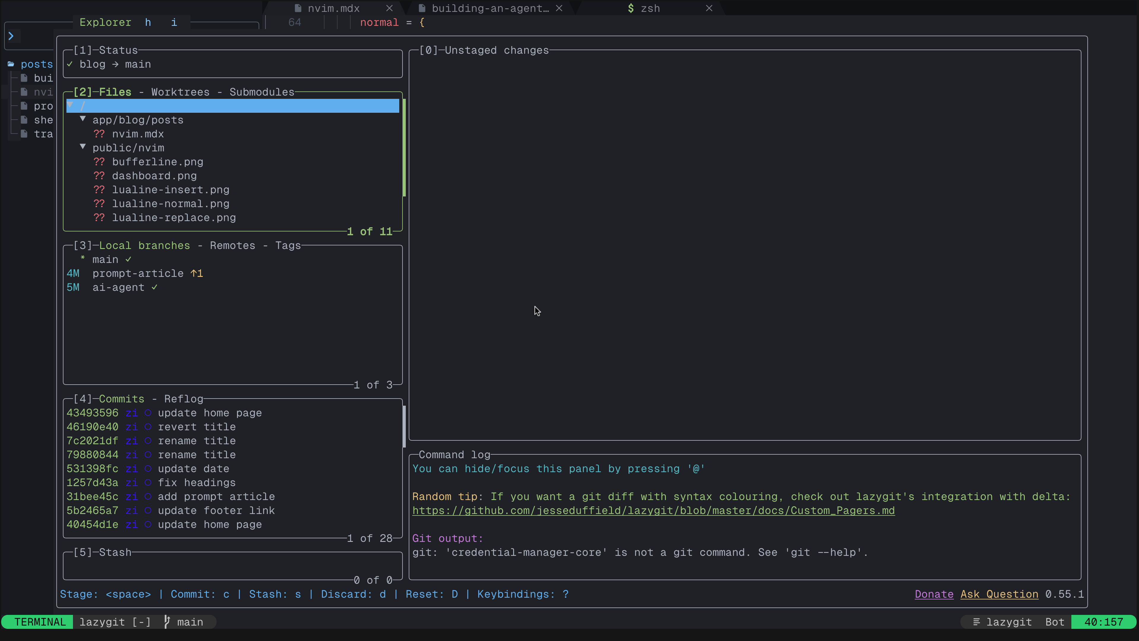 For a smooth Git workflow, I installed several plugins. You can already see one in the lualine